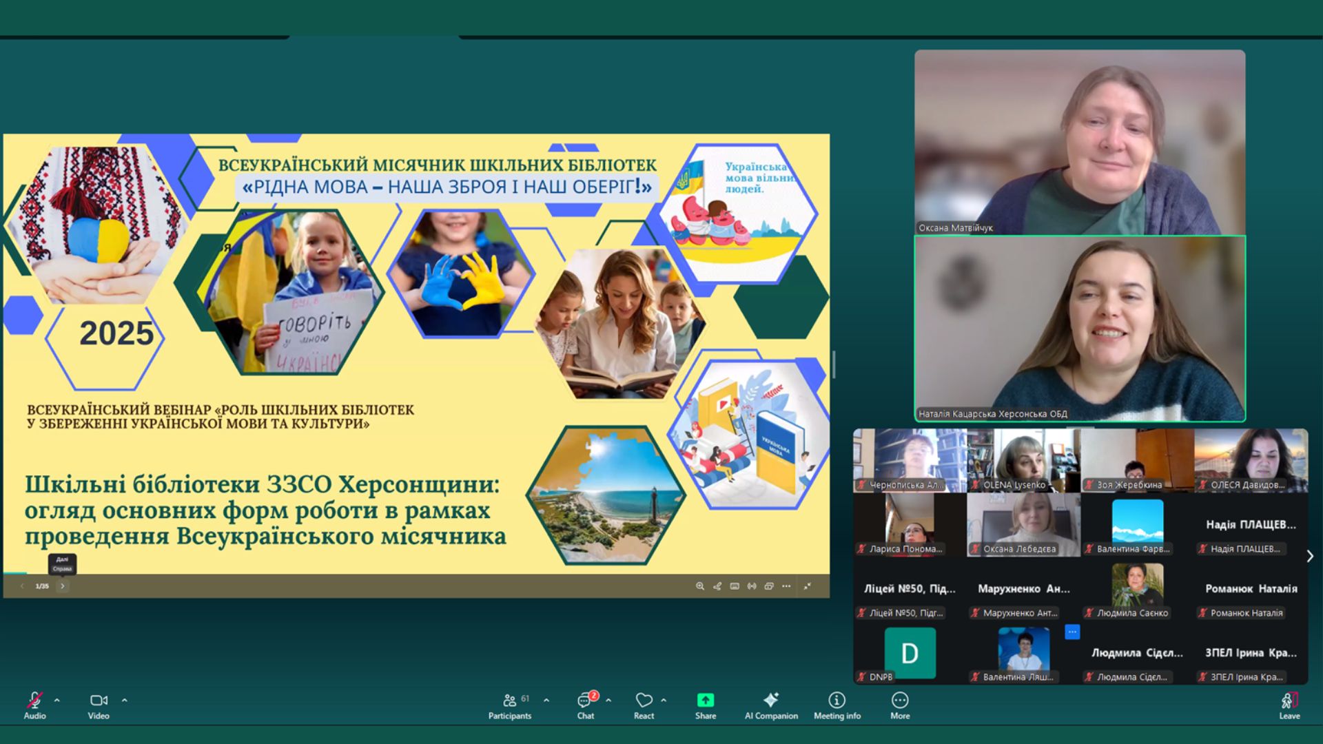 Роботу шкільних бібліотек Херсонщини та огляд основних форм роботи в рамках проведення цьогорічного Всеукраїнського місячника, партнерство шкільних і публічних бібліотек представили у спільному виступі Наталія Кацарська, заступник директора з організації бібліотечного обслуговування Херсонської обласної бібліотеки для дітей імені Дніпрової Чайки, та Олеся Давидович, бібліотекар Антонівської гімназії № 21 Херсонської міської ради, координатор шкільних бібліотек Дніпровського району Херсонської міської ради.