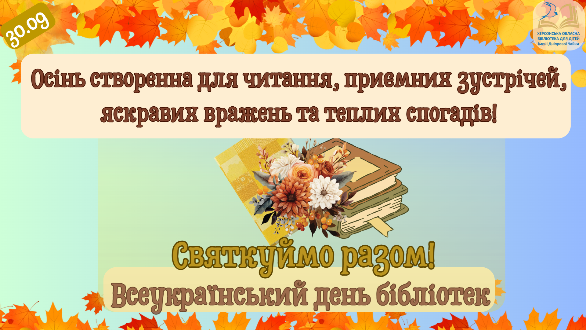 30 вересня, з нагоди відзначення Всеукраїнського дня бібліотек, Херсонська обласна бібліотека для дітей імені Дніпрової Чайки традиційно проводить обласний Відкритий урок читання як щорічну акцію для юних херсонців та читачів усієї області.