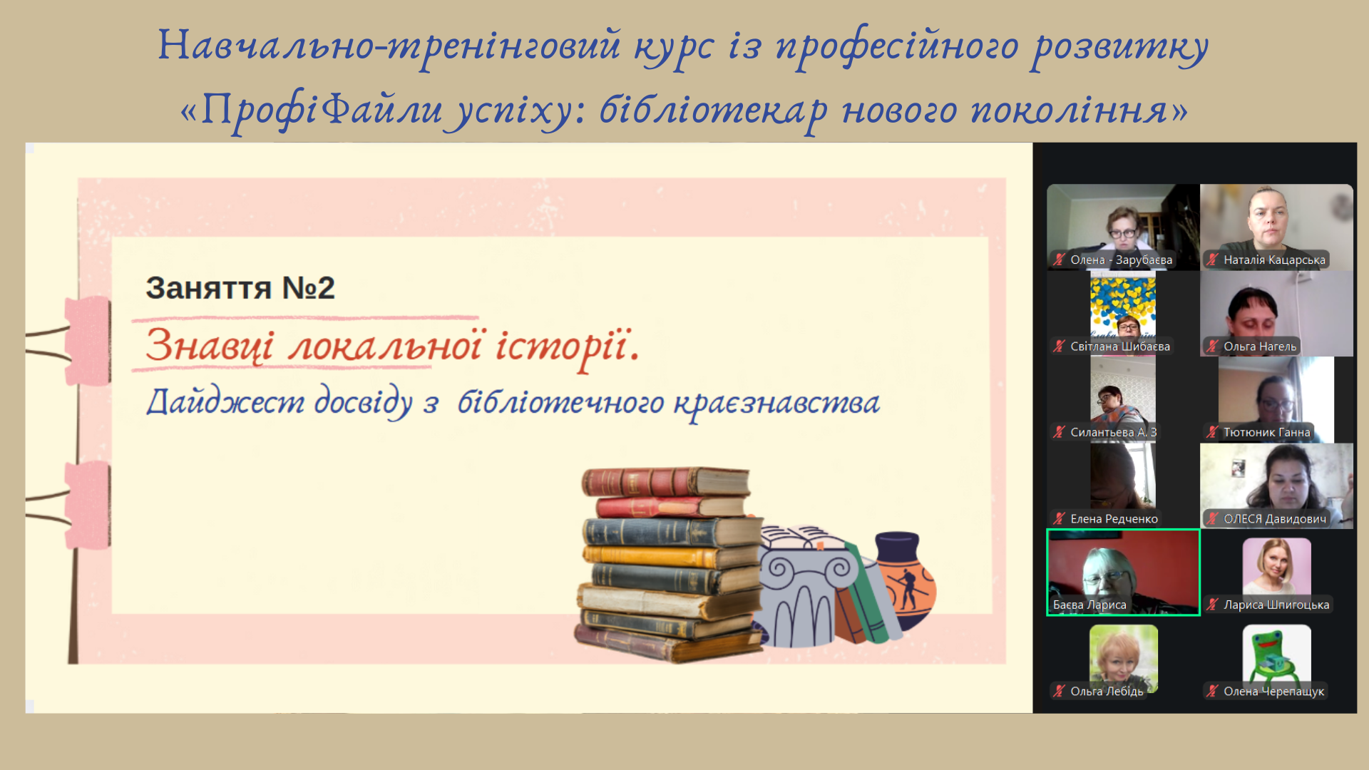 В рамка навчально-тренінгового курсу із професійного розвитку «ПрофіФайли успіху: бібліотекар нового покоління» для бібліотечних працівників закладів загальної середньої освіти відбулося друге заняття – за темою «Знавці локальної історії. Дайджест досвіду з бібліотечного краєзнавства».