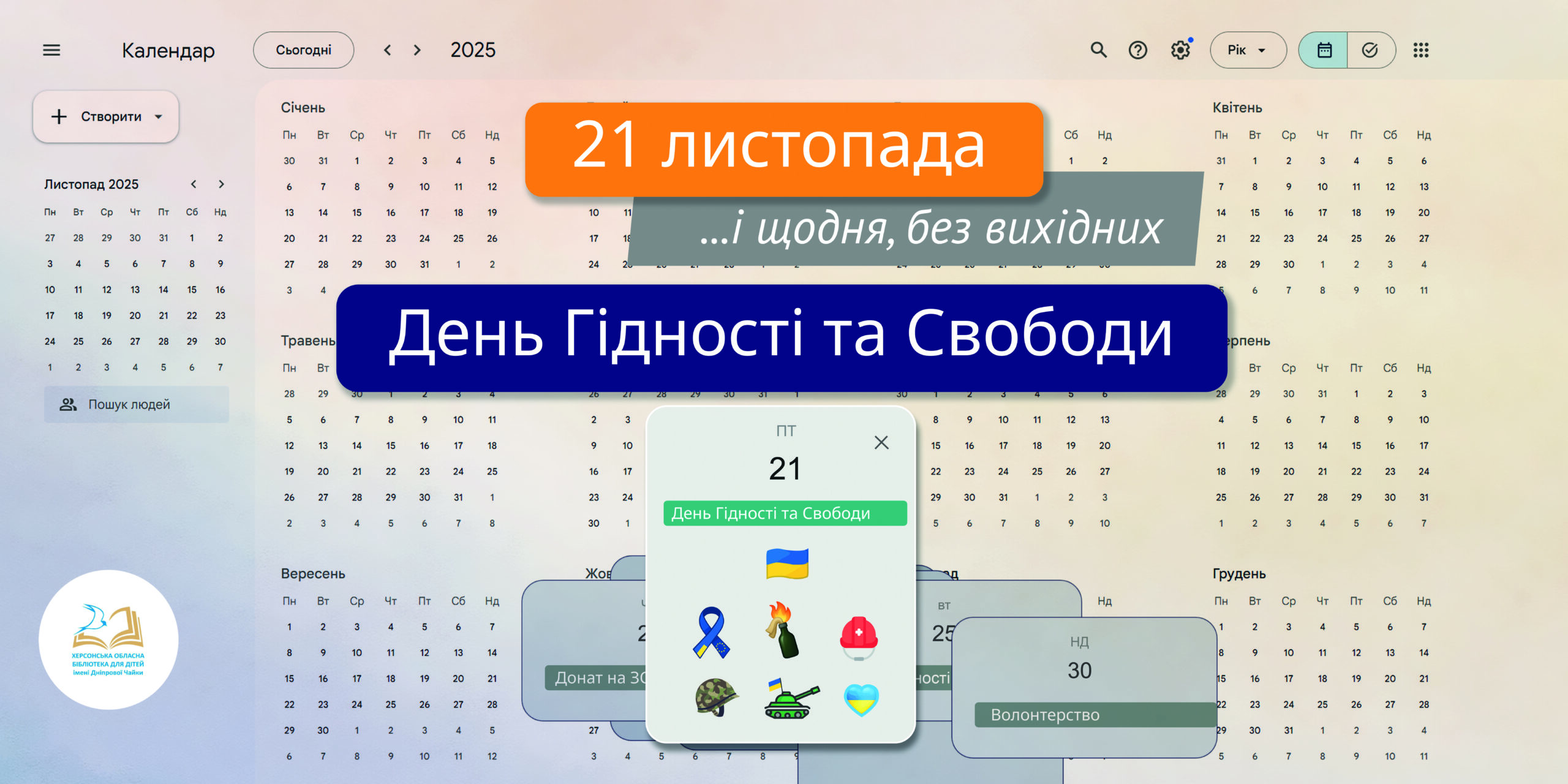 У цей день важливо не лише згадувати події минулого, а й передавати їхній сенс новим поколінням. Саме з цією метою головною бібліотекаркою читальної зали Херсонської обласної бібліотеки для дітей імені Дніпрової Чайки було організовано і проведено для учнів херсонських навчальних закладів № 36, № 44 і Херсонського Таврійського ліцею серію патріотичних заходів у форматі поетичного маніфесту «Слова як кулі, кулі як слова», які були присвячені річницям двох революцій, що стали символами боротьби українців за свої права та гідність.
