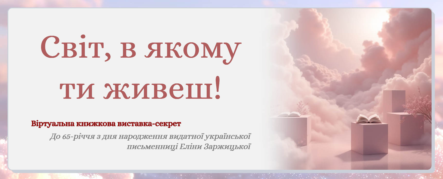 Отже, до уваги керівників дитячого читання та самих читачів – віртуальна книжкова виставка, присвячена 65-річчю від дня народження сучасної української письменниці, журналістки, громадської діячки, Золотої письменниці України Еліни Заржицької.