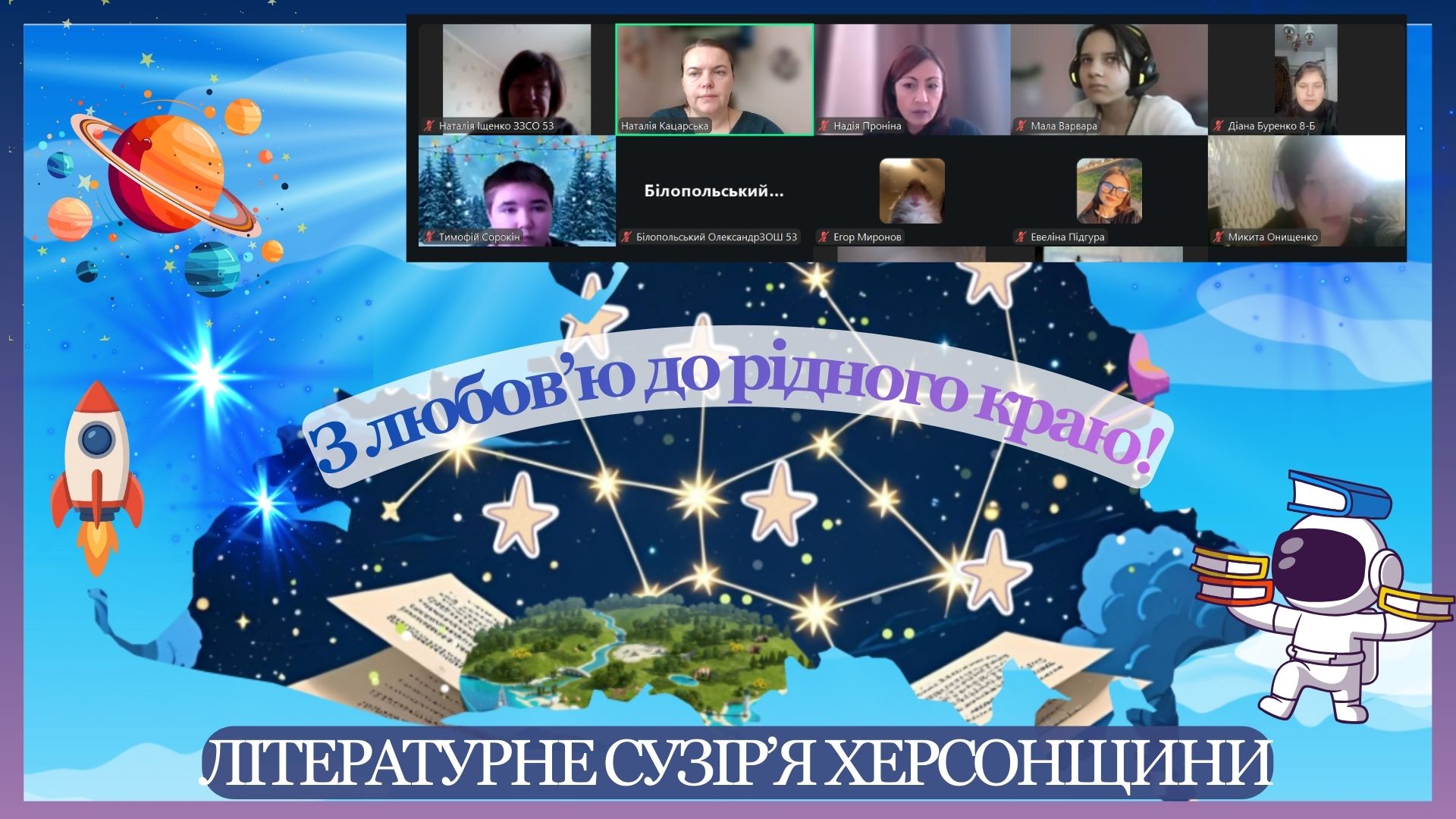Херсонщина по праву вважається землею, багатою на яскраві літературні таланти митців: поетів, прозаїків, драматургів. Твори патріотів, закоханих у батьківщину, формують культурне обличчя краю. У цьому змогли переконалися учні 7-9-х класів Херсонської загальноосвітньої школи І-ІІІ ступенів №53 Херсонської міської ради, взявши участь у краєзнавчому заході «З любов’ю до рідного краю! Літературне сузір’я Херсонщини», організованому фахівцями Херсонської обласної бібліотеки для дітей імені Дніпрової Чайки.