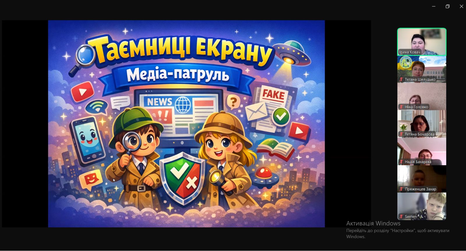 Фахівці Херсонської обласної бібліотеки для дітей імені Дніпрової Чайки – медіатренери – провели інтерактивний онлайн-урок з медіаграмотності «Таємниці екрану. Медіа-патруль» для учнів-читачів молодшої школи Іванівського ліцею №1 Іванівської селищної ради Херсонської області. Захід був спрямований на формування у дітей 8-10 років важливих навичок критичного мислення та безпечної поведінки в інформаційному просторі.