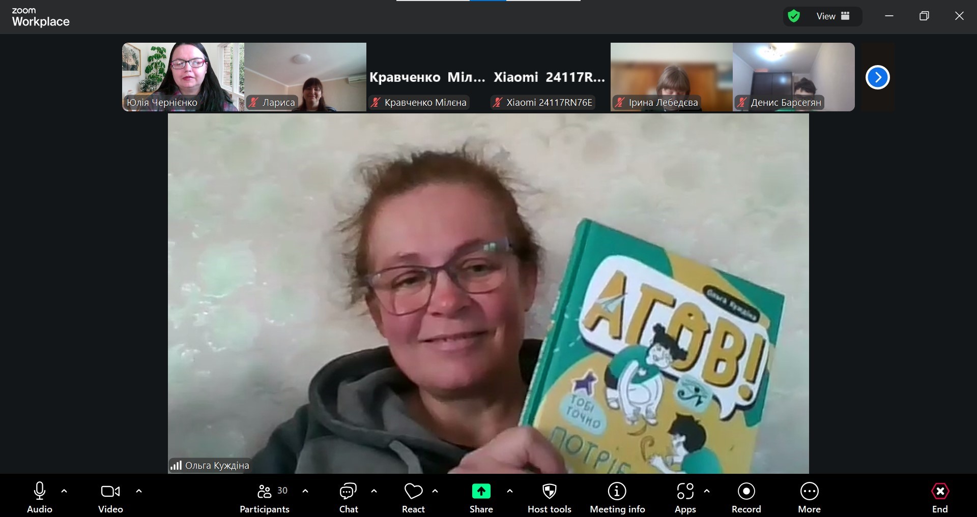 Скріншот екрану зустрічі онлайн з письменницею Ольгою Куждіною