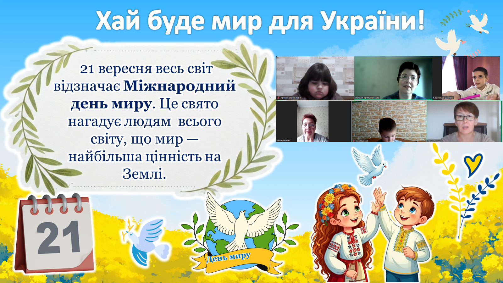 До Міжнародного Дня миру фахівці відділу обслуговування юнацтва та молоді Херсонської обласної бібліотеки для дітей імені Дніпрової Чайки організували для учнів 5-6-х класів Херсонського загальноосвітнього навчально-виховного комплексу №11 Херсонської міської ради. патріотичну мозаїку «Голуб миру кличе нас!». Захід мав на меті виховання у дітей поваги до миру, формування громадянської свідомості та знайомство з історією та символами цього важливого свята.