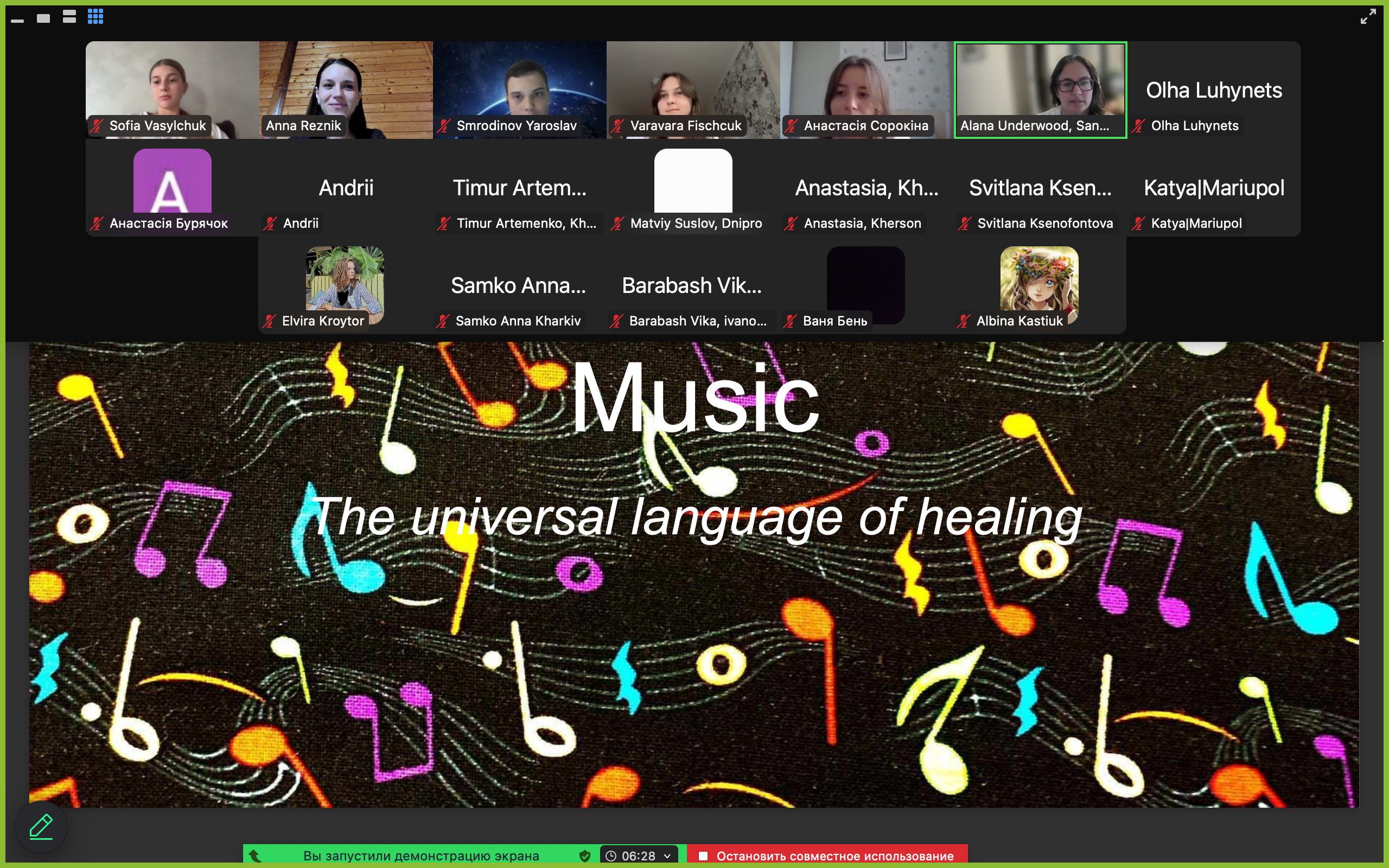 Після такої розминки учасники заглибилися в тему. Дослідили, як музика об’єднує людей, піднімає настрій і навіть допомагає нам зцілюватися. Разом з американською подругою Аланою Андервуд учасники клубу поговорили про трансформаційну силу музики – як вона допомагає нам розслаблятися, справлятися з проблемами та виражати емоції. Учасники поділилися своїми улюбленими піснями, обговорили, як музика впливає на їхні почуття, та практикували англійську мову за допомогою інтерактивних занять і вивчення нової лексики.